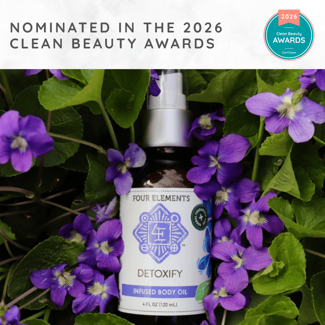 Elements: sunflower oil, grapeseed oil, violets, burdock*, figwort*, poke root*, vitamin E, orris, blue yarrow, and orange essential oil, Black-eyed Susan, flower essence. Organic*